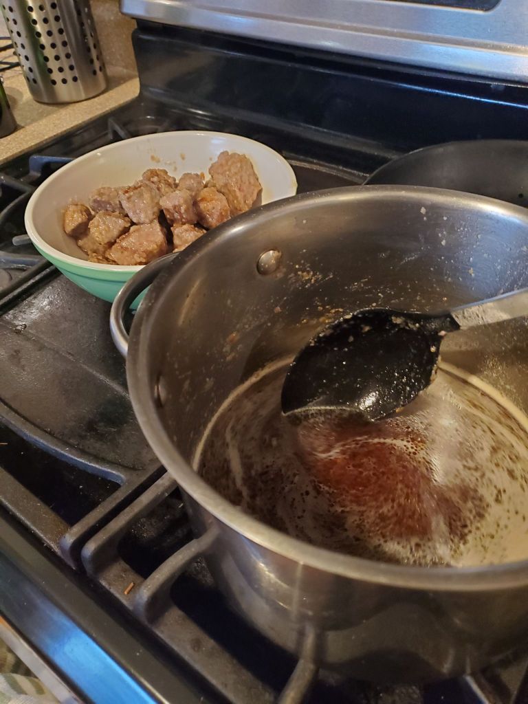 - Warm the oil in a large, heavy pot over medium-high heat. Add the beef and cook for about 5 minutes, turning to brown all sides evenly. The recipe says to do a little of the meat at a time in batches, to be sure not to overcrowd the pot, but I was impatient and just did it all at once. I kept a close eye on it and it turned out fine. Just had to stir more often.
