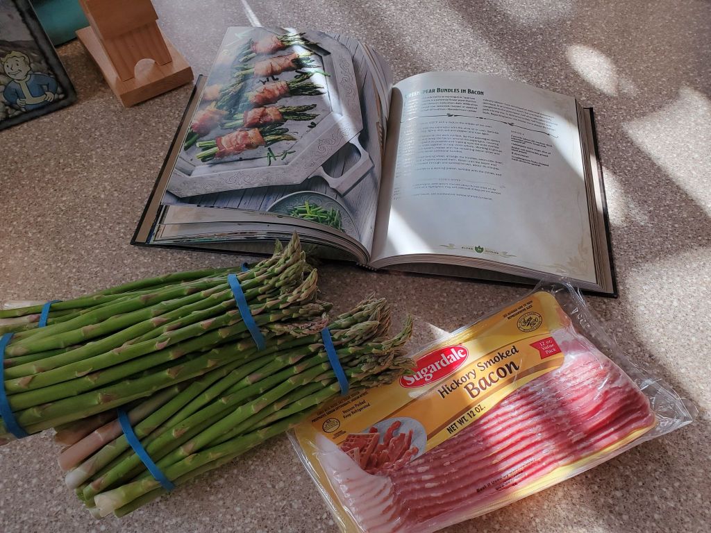 These bacon wrapped asparagus or “Greenspear Bundles in Bacon” as Heroes’ Feast calls them are called a “preperation technique” created by half-elves, who are liberated from certain culinary taboos of their elven brethren.