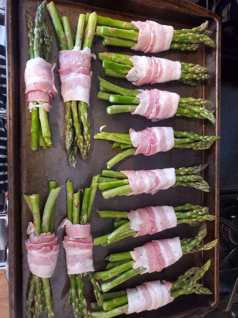 - Then you will lay out your bacon wrapped asparagus on a cookie sheet, making sure the loose end of the bacon is on the bottom so it doesn’t come unraveled!