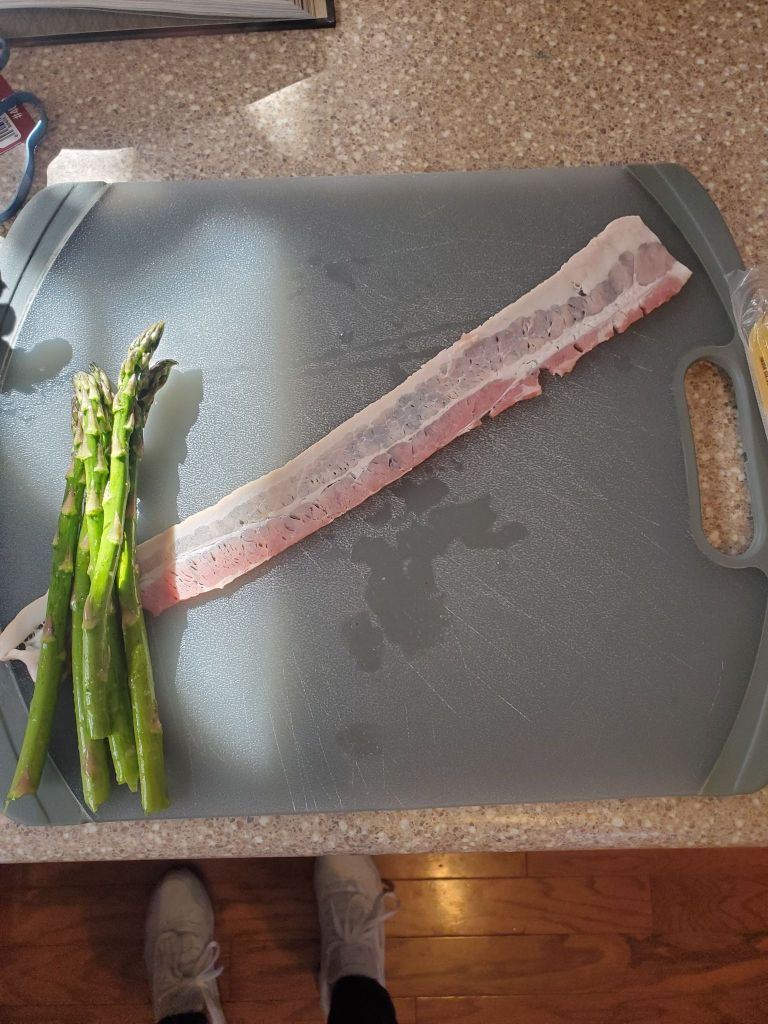 - Once they are good and coated, you will then wrap 4-5 spears in one slice of bacon. You will lay the bacon at an angle so that as you are wrapping, the bacon doesn’t completely overlap itself. The number of spears you wrap depends on how thick the stalks are. The recipe calls for medium-thick stalks, but the grocery store by me only had thinner ones. Because of this, I added an extra spear to my bundles.
